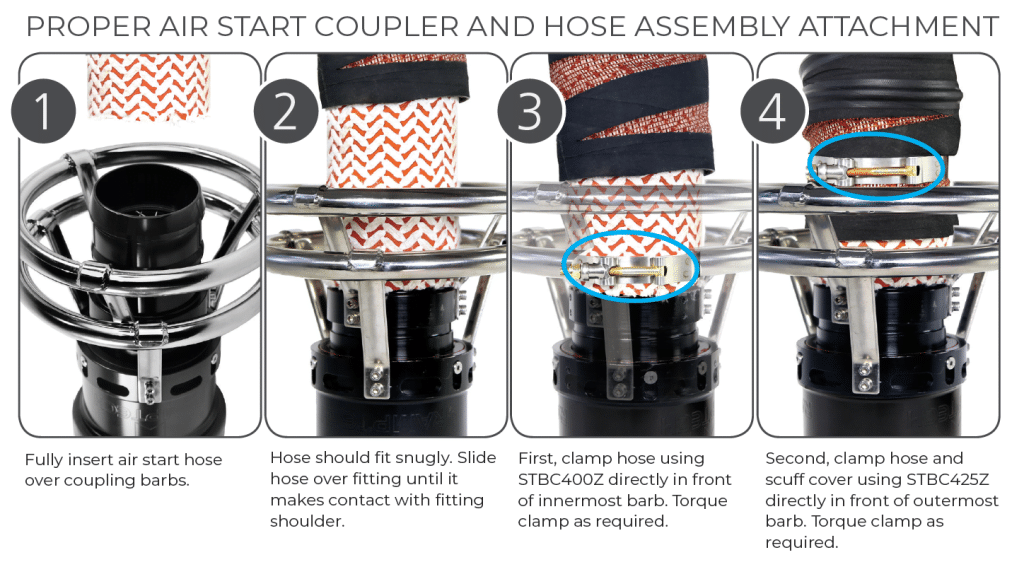 Hose and scuff cover appearance may vary from brand to brand. However, the basic process remains the same. Use the first clamp (STBC400Z) to secure the hose to the fitting only. Use the second clamp (STBC425Z) to secure the scuff cover to the hose.