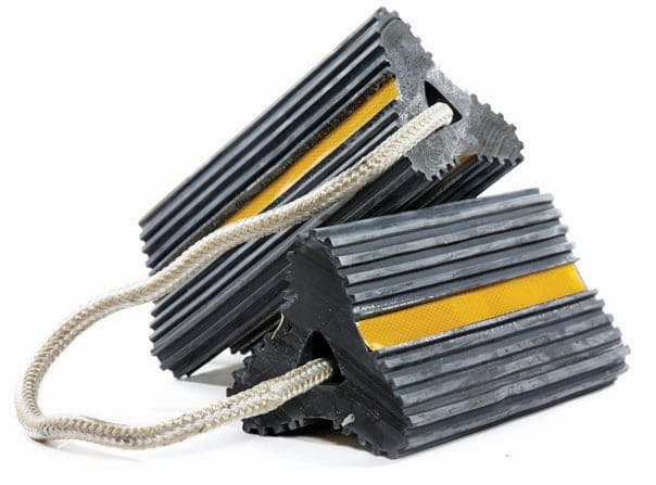 Wheel chocks are constructed of highly durable, ribbed rubber that is infused with UV inhibitors to prevent color fade. High visibility vinyl 3M™ reflective strips are on all three sides on the chocks.